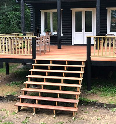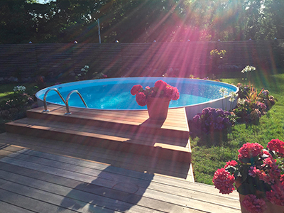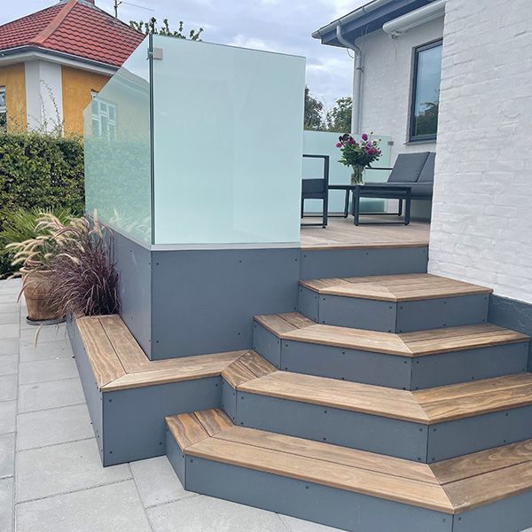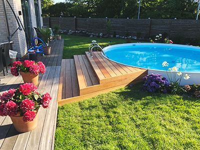 En red Wood trappe fra terrassen til poolen. En havelåge.